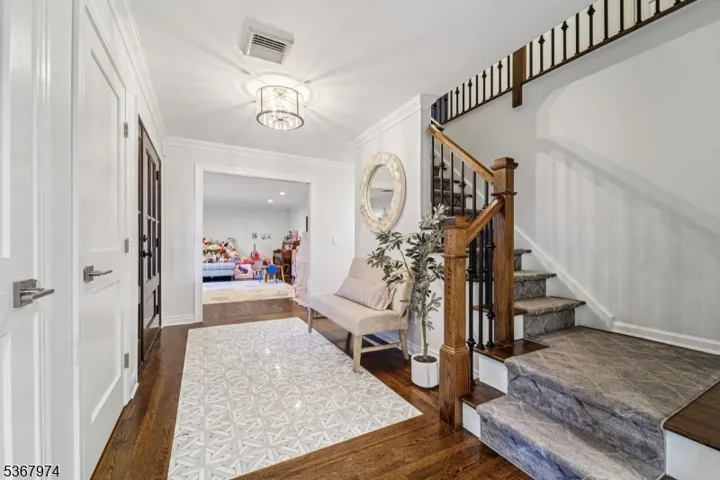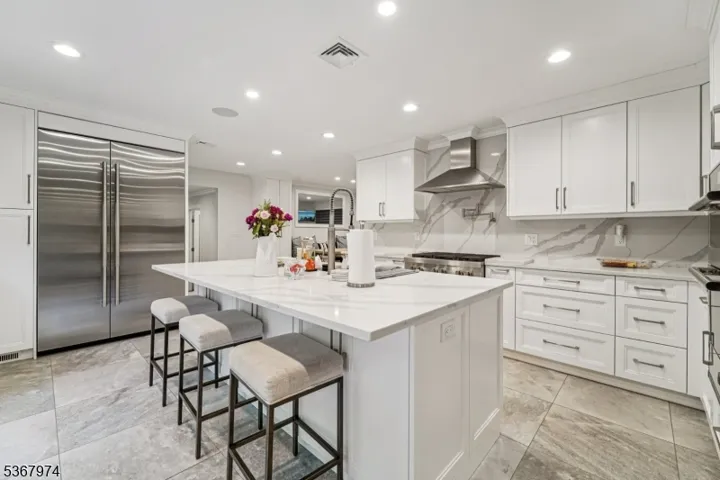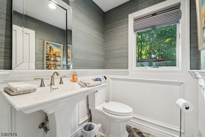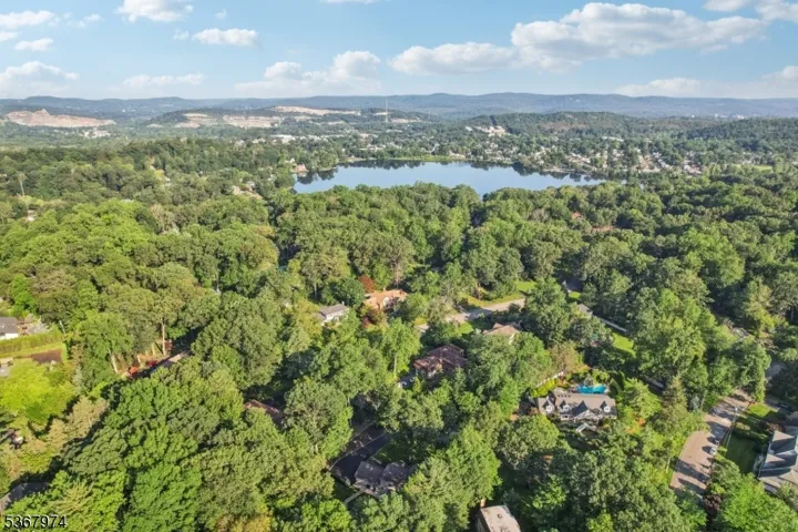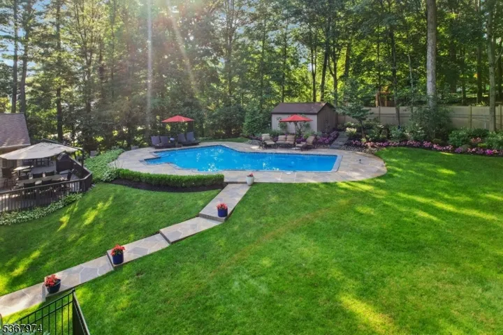Welcome home to this meticulously maintained 4-bedroom, 2 full and 2 half bath Tudor-style residence, beautifully set on a generous, professionally landscaped lot. A welcoming entry foyer leads into the elegant living room, filled with natural light and perfect for relaxed entertaining. Continue into the expansive family room featuring soaring ceilings, custom built-ins, oversized windows, and a charming brick fireplace an ideal setting for cozy evenings. The formal dining room offers the perfect backdrop for everything from quiet dinners to festive gatherings, while sliding glass doors open to a large rear deck designed for al fresco dining and summer grilling. The gourmet kitchen is a chef’s dream with custom cabinetry, Corian countertops, double wall ovens, gas cooktop, and center island with bar seating. A mudroom, laundry area, powder room, and garage access add convenience to the main level. Upstairs, the serene primary suite boasts a sitting area, walk-in closet, and en suite. Three additional bedrooms one currently used as a home office share a full bath. The full partially finished basement offers den, gym, powder room and abundant storage. Step outside to your private backyard retreat featuring a fully fenced, wooded yard with lush greenery, an expansive deck, an in-ground pool, and patio perfect for luxurious outdoor living and entertaining. This home offers the perfect blend of timeless elegance, everyday comfort, and resort-style living both indoors and out.