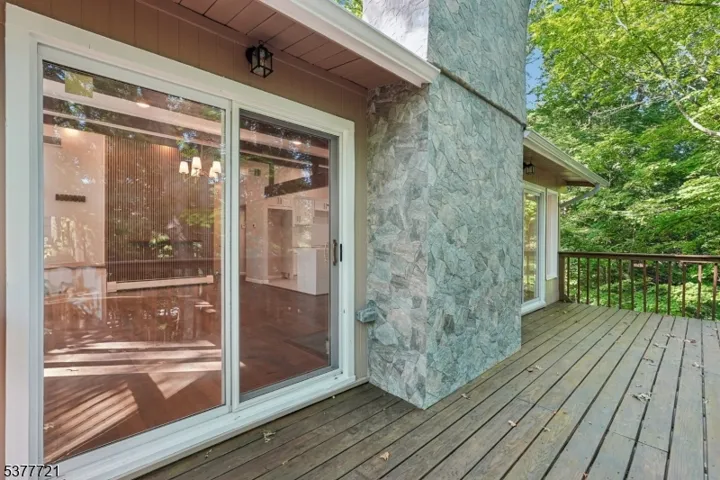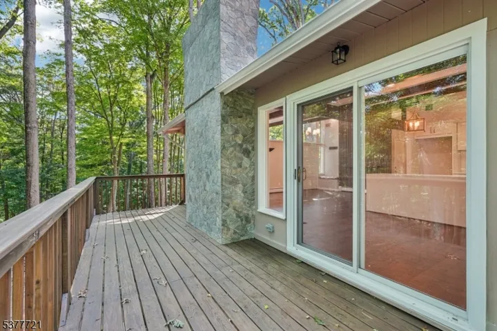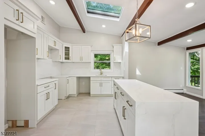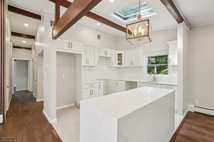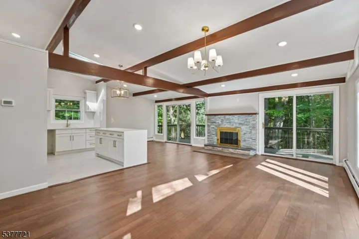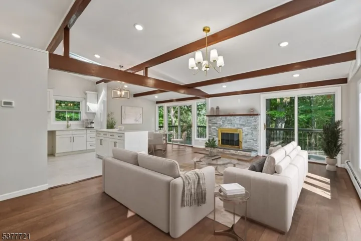 Welcome home to this beautifully renovated 4 bedroom, 3 bathroom Raised Ranch, perfectly nestled on a private wooded lot in the heart of Wayne. Step into the inviting entry foyer that opens to a bright, open-concept main living area. The living room boasts large windows, exposed wood beams, and a charming wood-burning fireplace, creating a warm and welcoming space for conversation and relaxation. Seamlessly flowing into the dining room, you’ll find an elegant setting for intimate meals or lively gatherings, with sliding glass doors leading to a spacious rear deck ideal for outdoor entertaining, al fresco dining, and taking in stunning wooded views. The chef’s kitchen is a showstopper, featuring custom cabinetry, marble countertops, wood beams, center island and a skylight that bathes the space in natural light. The first floor also offers a serene primary suite with ample closet space and a private bath, plus and 2 additional bedrooms and full bath. Downstairs, enjoy a versatile living area with a den, fourth bedroom, kitchenette, full bath, garage entrance, and walkout to the backyard. Gorgeous hardwood floors and rustic beams run throughout. The expansive yard provides endless opportunities for outdoor activities in a peaceful, natural setting. With a 2-car garage, ample parking, and a location close to NYC transportation, shopping, and dining, this home offers the perfect blend of modern comfort and tranquil retreat living.
