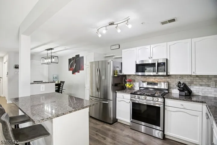 Meticulous, move-in ready second floor end unit condo featuring luxury vinyl flooring throughout main living areas. Open-concept living room, dining room and kitchen anchored around center island with built-in beverage refrigerator, granite countertops perfect for entertaining. Desirable split floor plan, offering a spacious primary suite, en-suite bath, WIC and a separate guest bedroom and full bath for privacy. . The laundry room includes includes washer/dryer with ample storage and an outdoor covered patio with an additional storage closet, This condo blends comfort, function, and modern finishes all in one! Easy access to RTES 22, 287,78 and NJ Transit.