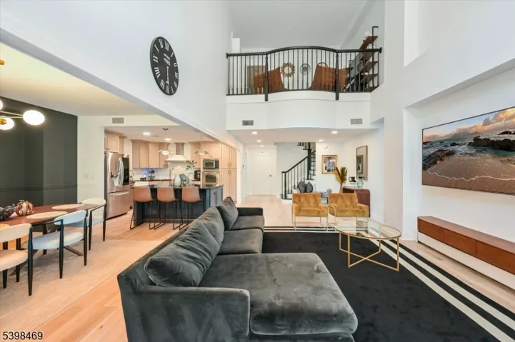 Discover refined living in this beautifully crafted 2,200 sq. ft. duplex condo in the sought-after Shearwater Court community of Port Liberte. This residence embodies upscale comfort with open interiors, abundant light, and timeless sophistication. The striking great room features soaring 18-ft cathedral ceilings that create openness and grandeur. Sunlight flows into the dining area and LR, while sliding doors lead to a private patio oasis, ideal for alfresco dining or mornings outdoors. The chef-inspired kitchen blends function and style with sleek finishes, ample cabinetry, and generous counter space to inspire culinary creativity. A convenient half bath is on the 1st level, perfect for entertaining. Upstairs, the primary suite offers a peaceful retreat with a spa-like en-suite bath and a versatile mezzanine, ideal as a reading nook or home office. Two addl BRs and a full bath complete the 2nd flr, providing privacy and comfort. This home includes central A/C, in-unit laundry, and access to Port Liberte resort-style amenities: 24-hr gated security, lap & infinity pools w/ skyline views, fitness ctr w/ saunas, tennis & basketball courts, dog runs, play areas, and waterfront promenades to Liberty State Park. Onsite conveniences include a dental office & Growing Seeds preschool. Easy NYC commute w/shuttle to Grove St PATH or ferry directly to Downtown NYC Pier 11. Minutes to highways, Holland Tunnel & Newark Liberty Intl Airport. Pets case by case.
