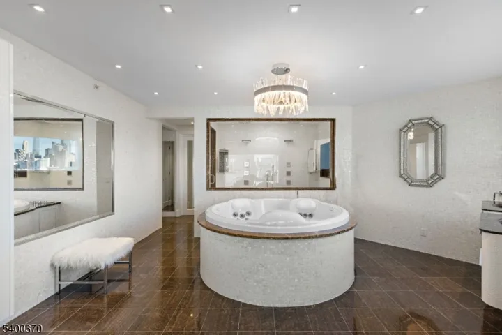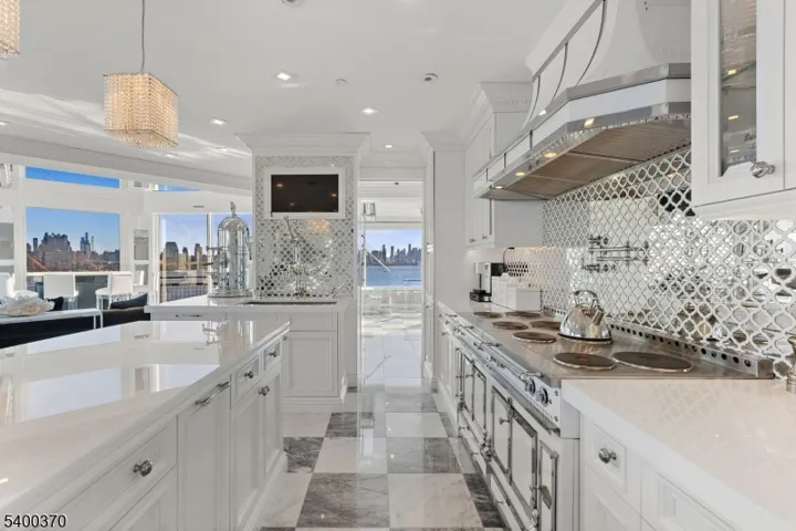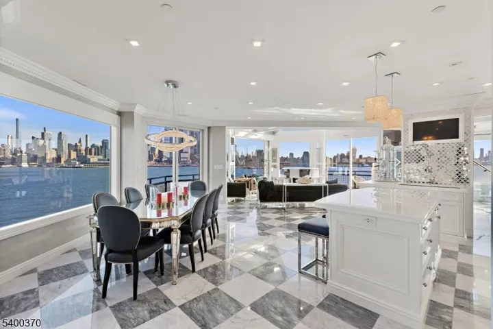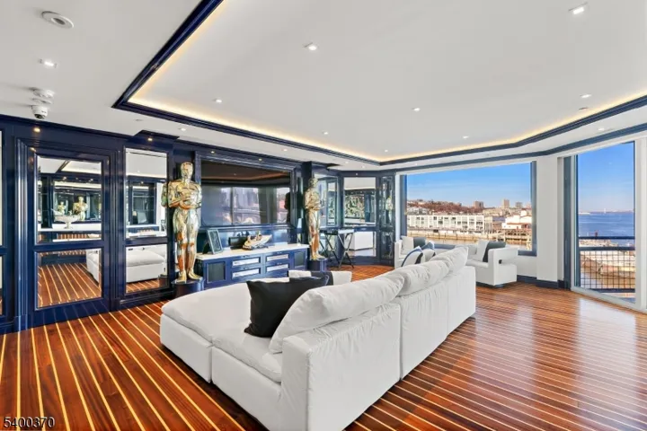 Stunning 2-story penthouse in the sky with breathtaking panoramic NYC & Hudson River views! Step off the private elevator to see gorgeous views and a glass staircase with built-in wine storage. Walk into the heart of the home and be surrounded by the entire NYC skyline: the 2-story great room has a bar, custom fireplace, two balconies, and allows you to see all the way from the George Washington Bridge to the Verrazano Bridge. The chef’s kitchen has white cabinetry/countertops, an oversized island and 8-burner LaCornue stove. The living room has custom paneling, a wet bar, and an additional balcony. The upstairs landing is a luxurious custom office space. The expansive primary suite has a glass loft over the great room, panoramic views, a fireplace, walk-in closet, and an enormous ensuite bathroom with its own views, dual sinks, a soaking tub, and walk-in shower. To round out this incredible home, it has 3 additional bedrooms with NYC/river views, ensuite bathrooms, and walk-in closets. It was redone with all new systems, radiant heat flooring, Sonos Bluetooth, and hurricane impact windows. Included is a NEST thermostat, electronic window shades, private storage and 2 parking spots. The luxury community of Riva Pointe offers 24/7 concierge and security, an indoor pool, fitness center, sauna, and terraces. Sitting just steps from the NYC Ferry as well as buses, light rail, the Lincoln Tunnel, and Whole Foods, this is the finest location on the entire Gold Coast waterfront.