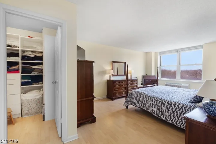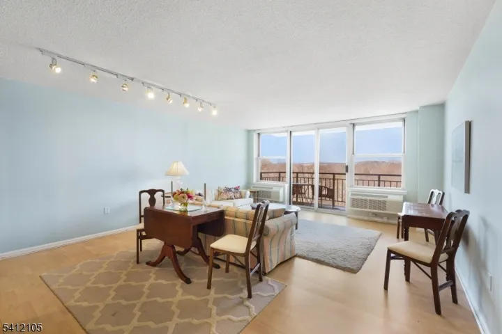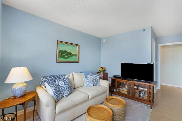 River views set the tone for this upper level residence, enjoyed directly from its private balcony overlooking the water, creating a peaceful outdoor extension of the living space. Entry begins in a true foyer, creating separation from the main living areas and offering a walk-in closet that provides everyday storage. From there, the home opens into a spacious living and dining area, offering a space for both formal dining and casual gatherings. A private balcony extends directly off the living room, providing an outdoor retreat with open views that add depth and dimension to the interior space. Its proportions allow for a full dining set and additional furniture if desired. The galley kitchen is designed with ample cabinetry, granite countertops, stainless steel appliances, and workspace along both sides. The layout maximizes functionality while keeping the kitchen neatly tucked away from the main living areas. The primary suite is generously sized and features a walk-in closet along with an ensuite bathroom. The second bedroom offers flexibility for guests, a home office, or additional living needs. Residents of The Mill enjoy an array of amenities, including a state-of-the-art fitness center, a renovated community room, tennis courts, an in-ground swimming pool, scenic walking and jogging paths, and the plaza deck overlooking the waterfalls. Located near shops, restaurants, and NJ Transit bus and train options, this community offers easy access to NYC and Hoboken.