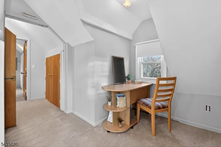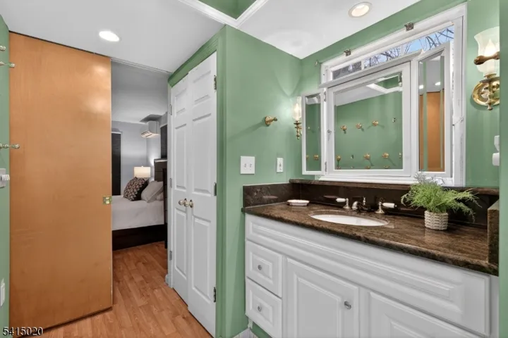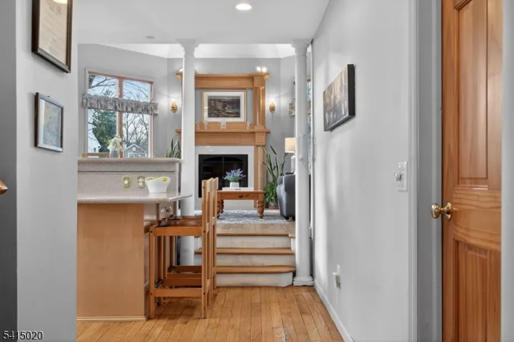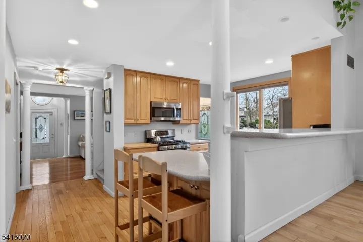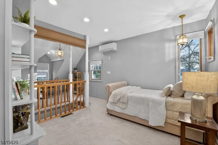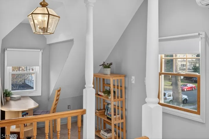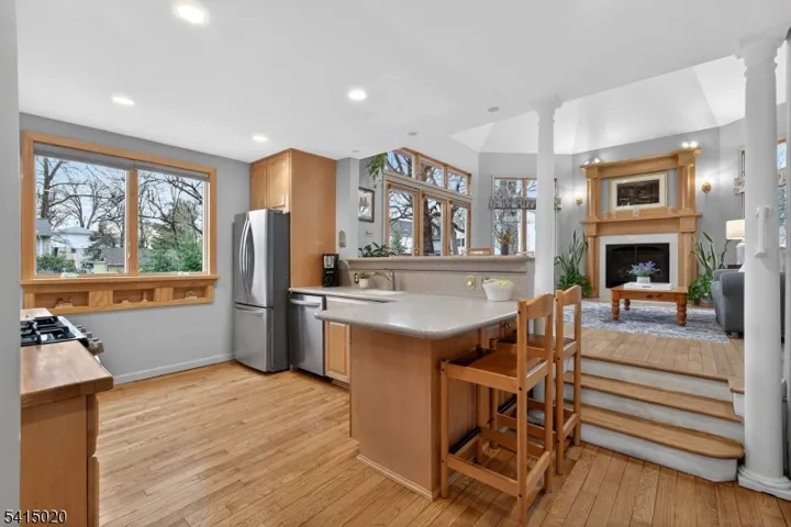 Expanded Cape set on a generous 7,500 sq. ft. lot featuring a dramatic 18′ x 18′ great room with vaulted ceilings, skylights, and angled walls, where soaring windows bathe the space in natural light. The open dining area flows into a modern kitchen w/wood cabinets, stainless appliances, a peninsula with seating, wood floors and a breakfast bar. The great room features a gas fireplace with a striking double-height mantle creates a beautiful focal point. The first-floor primary suite includes ample closets and a spacious tiled bath. Convenient first-floor utility room includes a washer/dryer, laundry sink, tankless water heater,.200 amp elec panel, skylights and abundant storage The second floor boasts an additional bedroom with a full bath and generous closet space. A loft overlooking the great room offers flexible space for a guest room, office, or potential third bedroom. Outdoor living is exceptional with three tiers of expansive decking overlooking the private backyard and adjoining Green Acres property. A nearby footbridge provides easy access to the path leading to Nomahegan Park with its scenic trails and parkland. Additional highlights include low-maintenance vinyl siding and efficient climate control with two compressors and six split heat/AC units providing flexible comfort throughout the home. Enjoy the award winning downtown that Cranford has to offer w/delightful restaurants, coffee and specialty shops gift shops, boutiques and bus and train transportation to NYC.