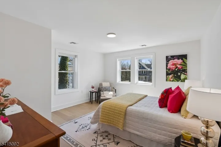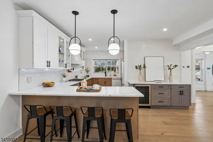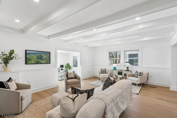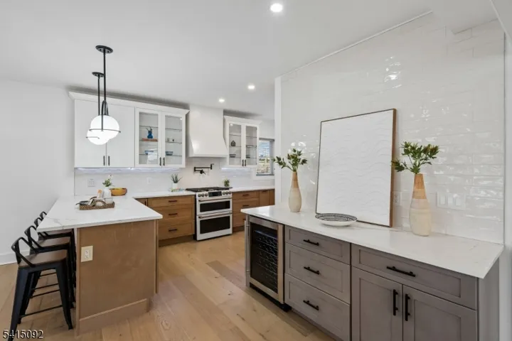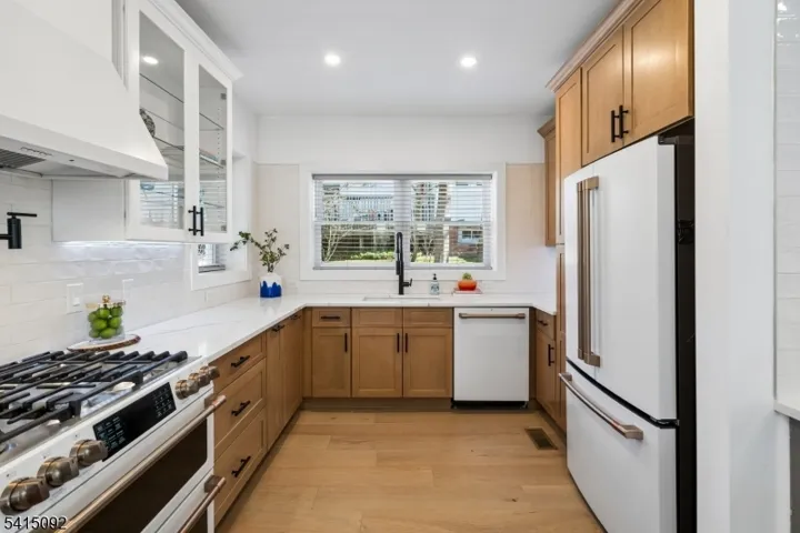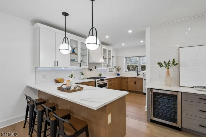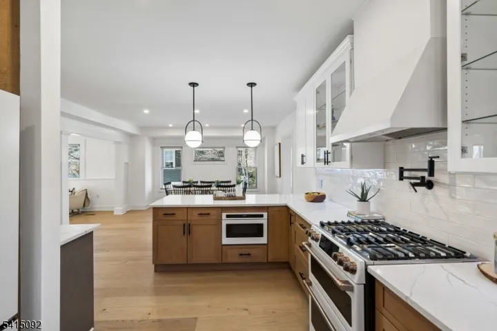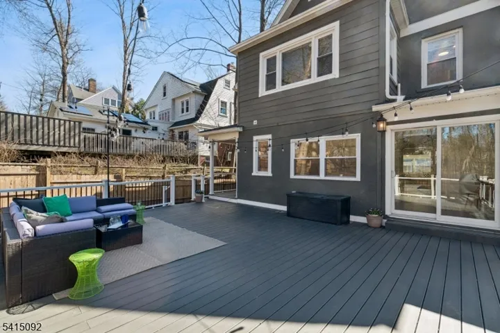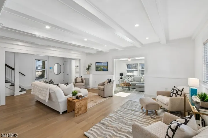 Incredible Maplewood dream home in a coveted location just steps from Village, trains and parks. Extensively renovated in 2024, this turn-key home offers nearly 4000 sq. ft. of living space across 4-levels with light-filled rooms arranged in a versatile, flowing floorplan. Enter into a dreamy, open-plan 1st floor which beautifully blends period details (beamed ceilings, wide moldings) with stunning modern finishes, including stylish lighting and wide-plank French oak flooring. The dream kitchen features high-end GE Cafe appliances, gas range with pot filler, quartz counters, tile backsplash, ceramic sink and full-height, soft-close cabinety. A breakfast bar with seating and serving bar with beverage fridge are nearby. Generous dining room and living room spaces, a sun-drenched family room, half bath and versatile sunroom overlooking the yard complete this level. Upstairs find bright bedrooms and 3 full baths, including the sophisticated primary with large walk-in closet and spacious bath with double vanity, soaking tub and glass-enclosed shower. The lower level is fully finished to offer leisure space, laundry room with sink and built-in cabinets and bonus full bath with shower and access to the garage. The fenced backyard features a composite deck overlooking a private, woodsy backyard. 2024 updates include a new roof and gutters, new thermal windows, new thermal side doors and custom built-in shelving. Smart home dimmers (1st flr), Nest thermostats and front door lock.