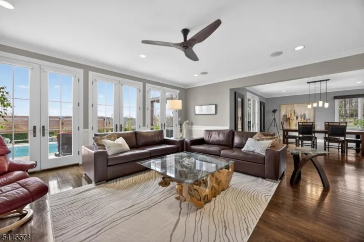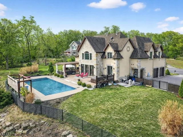 Perched above Lake Mohawk with sweeping water and mountain views, this architecturally striking European-inspired cul-de-sac residence offers resort-style living minutes from Sparta’s vibrant town center. Stone and stucco detailing, dramatic roof lines, and beautifully scaled interiors create a distinctive presence while refined finishes provide both elegance and comfort.At the heart of the home, the chef’s kitchen features professional-grade stainless appliances, custom cabinets and an expansive center island ideal for gathering. A built-in beverage bar connects seamlessly to the living and dining spaces, creating effortless flow for entertaining. FIVE sets of french doors from the den, living room and dining room open directly to the terrace, placing the resort-style backyard just steps away and creating seamless indoor-outdoor living. The outdoor setting includes a heated in-ground pool, pergolas, fireplace, and garden area perfect for summer evenings and weekend gatherings.Upstairs, spacious bedrooms offer spa-like baths and scenic views. The finished walkout lower level provides flexible space for media, fitness, office, or recreation. Natural gas line to home and meter installed.Surrounded by the lifestyle amenities that define the region, including nearby championship golf courses, Crystal Springs Resort, fine dining, skiing, boating, hiking, and year-round outdoor recreation. A rare opportunity to enjoy resort-style living in the scenic hills above Lake Mohawk.