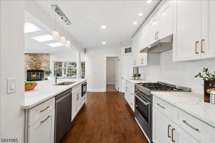 Nestled on a picturesque .36-acre property along a quiet, tree-lined street, this enchanting Tudor home beautifully blends timeless character with sun-drenched living spaces. Ideally located within walking distance to both the Short Hills and Millburn train stations and vibrant downtown, the home offers exceptional convenience paired with classic charm. Rich architectural details?including original ceiling beams, leaded glass windows, and three fireplaces?create a warm, inviting ambiance throughout.Flooded with natural light, the home?s gracious interior features a stunning sunroom with floor-to-ceiling windows and an expansive, open-concept kitchen outfitted with stainless steel appliances and an oversized center island, seamlessly flowing into the family room with skylights, a gas fireplace, and French doors leading to a spacious deck?perfect for indoor-outdoor living. The sunken living room adds to the home?s distinctive appeal, while thoughtful design ensures both elegance and comfort at every turn.This charming residence offers 5 bedrooms and 5.1 baths, including a luxurious primary suite with a gas fireplace and spa-like bath. The second level features two additional en suite bedrooms and a guest bedroom, while the third-floor suite provides a private retreat ideal for home office, or art studio, complete with a full bath and generous living space. This home is truly a rare and captivating offering.