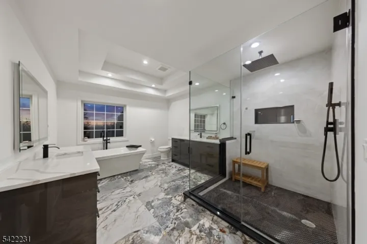 Set on nearly seven private acres in Chester, this 2023-built residence delivers a true lifestyle property where luxury meets land. Surrounded by mature woods with established trails, the setting invites riding, exploring, and complete privacy just minutes from town and access to top-rated schools. A classic center hall colonial layout is immediately apparent, with a formal living room and formal dining room on either side of the entry. The home opens into a light-filled great room with soaring two-story ceilings and a statement fireplace, seamlessly connected to a designer kitchen with quartz surfaces, custom cabinetry, and stainless appliances. Above, an open overlook balcony adds architectural interest and provides a view into the main living space. The layout is ideal for both everyday living and entertaining. A convenient side-door entry leads into a practical mudroom area with built-in organization. Upstairs, all four bedrooms are thoughtfully positioned, including a stunning primary suite with cathedral ceilings, dual walk-in closets, and a spa-caliber bath with radiant heated floors, soaking tub, and oversized shower. Every bathroom features high-end tilework and radiant heat. The brand new walkout lower level adds additional living space with a full gym, built in bar, and flexible recreation area. Outside, the grounds are open and usable, previously home to an in-ground pool, offering a proven pool site for future plans.
