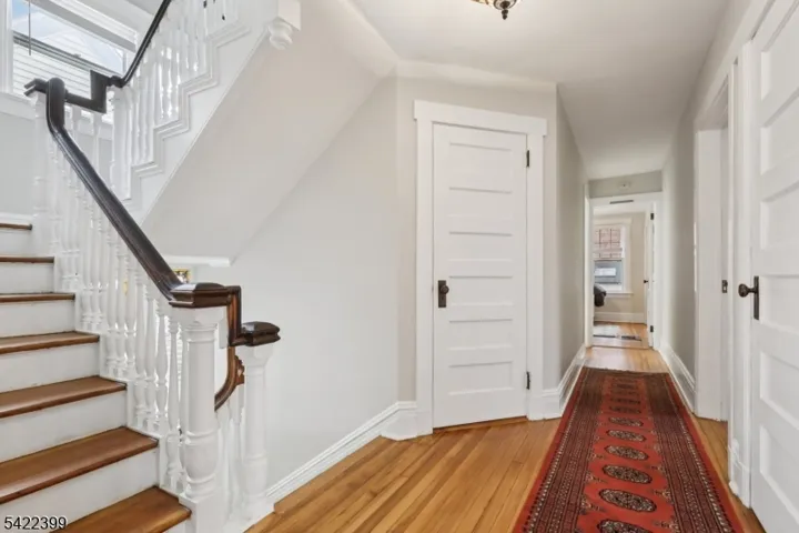 This stunning and spacious Victorian set on a corner lot, lined with charming cherry blossom trees, embodies the sought-after Montclair lifestyle, where the city meets the suburbs. Timeless architectural details greet you at the wraparound porch before entering the double-door vestibule, leading to a grand foyer and impressive staircase. Rich in historic charm – crown moldings, decorative trim, stained glass windows – all thoughtfully integrated with modern updates. Custom built-ins frame the formal study, flowing seamlessly into the dining room with stunning fireplace and large windows that fill the space with natural light. Bright, inviting kitchen offers stainless steel appliances, quartz countertops, and a breakfast bar that opens to a relaxed living area. Full bath and powder room complete the 1st floor, ideal for entertaining. The 2nd floor features four bedrooms and two full baths, including oversized primary, while the 3rd floor offers two additional bedrooms perfect for guests or home office, plus a large walk-in storage room. Basement includes addtl. storage, gym space, laundry, and utility areas. Outside, a serene private patio and gated yard w/ fountain and lush landscaping evoke an English garden. Rare 3-car garage, paved driveway, and bonus shed provide ample parking and storage. Ideally located near the Library, Wellmont Plaza, Chvrch Street, Montclair Center, Bay St and Walnut St NJ Transit. This lovingly maintained 1897 home is a true architectural gem!