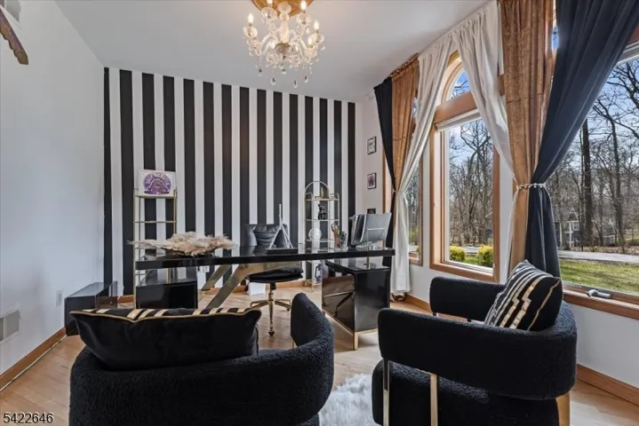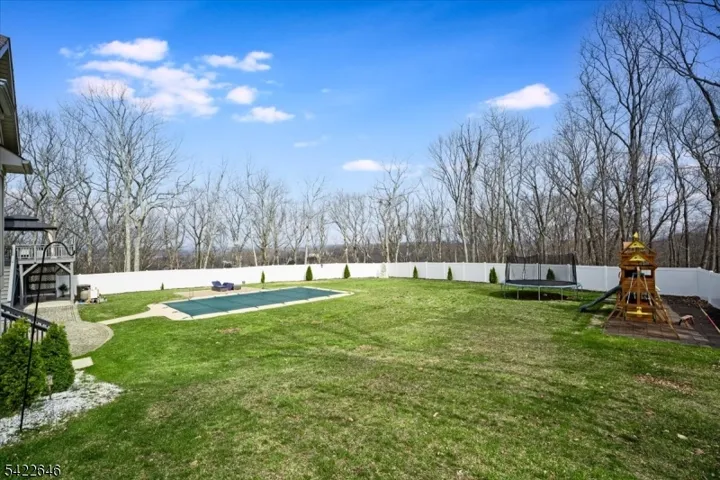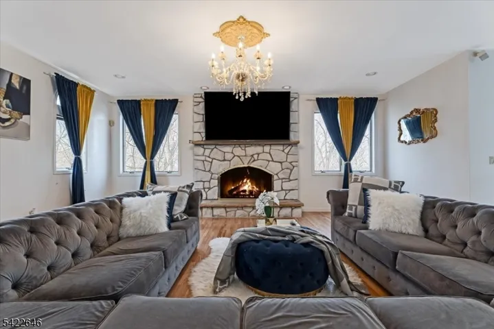 Sparta: Exquisite Colonial nestled at the end of a cul-de-sac with stunning mountain views in a charming neighborhood, close to commuter routes. Step inside through the elegant stone & stucco turret into a bright foyer featuring a first-floor home office overlooking the front lawn and water fountain. A half bathroom and laundry/mudroom with access from the 3-car garage are conveniently located to the right. Straight ahead, enjoy the sunken conservatory; to the left, the formal dining room the open living area with a cozy fireplace. The well-equipped kitchen opens to a deck perfect for outdoor dining and overlooks the grand backyard with an in-ground, heated safe pool. Upstairs, the second-floor primary bedroom offers a fireplace and two walk-in closets, along with a spacious primary bath featuring a jetted tub, stall shower, linen storage, and a dedicated water closet. Three additional bedrooms, a second office, and the main bath complete this level. Walkout basement adds even more value with a movie theater, bedroom, kitchenette, full bathroom, and a comfortable play/sitting area. There’s also a versatile under-front-porch turret room ideal for a workout space or wine cellar. Enjoy year-round comfort with a geothermal system and dual (2 unit) heat and A/C, helping offset operating costs. A great home to begin your adventures in Sparta, Sussex County minutes to golf courses, hiking trails, skiing, water park, camping, & hunting, plus Tri-State area fine dining restaurants.