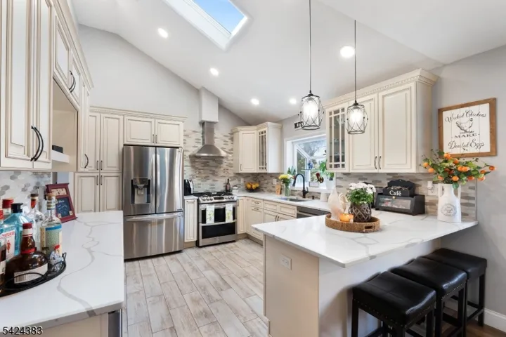 Beautifully updated home in a desirable neighborhood offering style, comfort, and modern amenities throughout. Step into the two-story foyer and proceed upstairs to a spacious living room featuring a large window that fills the space with natural sunlight. The living room opens seamlessly to the dining room, creating the perfect setting for everyday living and entertaining.The open-concept kitchen has been newly remodeled and features soft-close cabinetry, glass-front cabinets, breakfast bar, stainless steel appliances, wine refrigerator, stainless steel exhaust hood, glass tile backsplash, and high ceilings enhanced by a skylight, pendant lighting, and recessed lighting. Three bedrooms are located on this level, each offering hardwood floors and spacious closets. The beautifully designed main bathroom includes a freestanding soaking tub, custom tiled shower with bench and niche, and a sleek floating vanity.The ground level offers a generously sized family room with fireplace and ceiling beams, an additional bedroom, full bath, and separate outside entrance ideal for extended living or guest space. A two-car garage with EV charger adds convenience. Enjoy the entertaining backyard featuring a covered paver patio and firepit perfect for relaxing or hosting gatherings, along with an above-ground heated pool. Solar panels provide added energy efficiency.. This gorgeous home is close to Esposito Park and Kumpf Middle School.