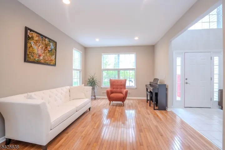 Welcome to this beautifully maintained and thoughtfully updated 4-bedroom, 2.5-bath home offering approximately 2,251 sq. ft. of comfortable living space in a desirable Bridgewater location. A grand two-story foyer with an elegant chandelier sets the tone for the warm and inviting interior. The first floor features hardwood flooring, recessed lighting, and custom blinds, creating a bright and modern feel. The updated kitchen (2018) offers quartz countertops, a designer backsplash, ceramic tile flooring, breakfast nook, pantry, built-in microwave, under-cabinet lighting, water filtration system, and a newer refrigerator (2021). The adjoining family room features a cozy gas fireplace. Upstairs includes newer carpeting and spacious bedrooms with ceiling fans. The guest bath is fully renovated with floor-to-ceiling porcelain tile, glass enclosure, and quartz countertop. The primary suite features two closets and a beautifully renovated bath with skylight, soaking tub, double sinks, quartz countertops, and a tiled shower with dual showerheads. Additional highlights include a first-floor laundry with built-ins, unfinished basement, and a 2-car garage with shelving and keypad access. Major updates include roof and HVAC (2021), furnace and hot water heater (5 years), and gutters (2 years). Enjoy outdoor living on the newer Trex deck with solar lighting, fire pit area, and Ring doorbell for added convenience.