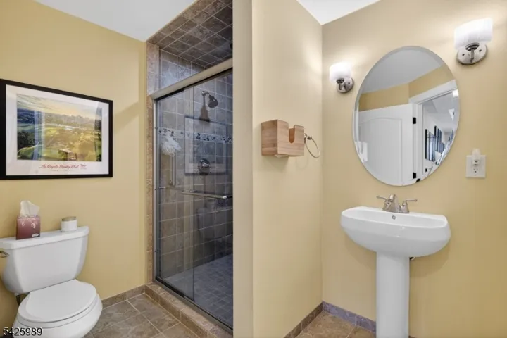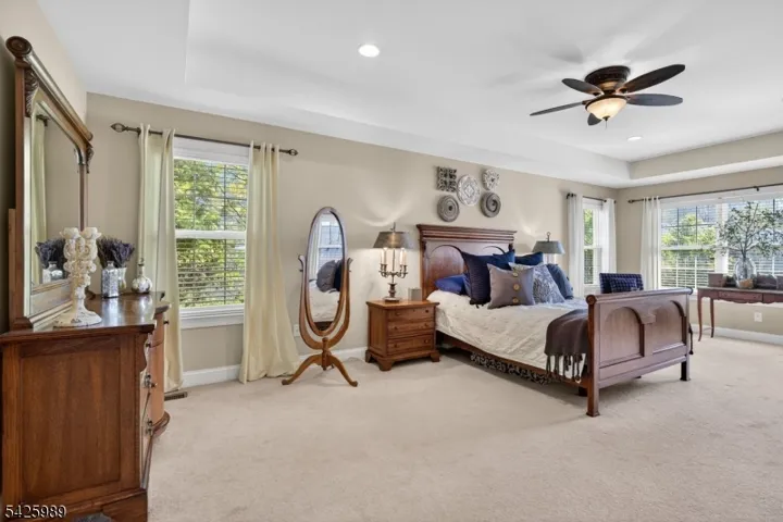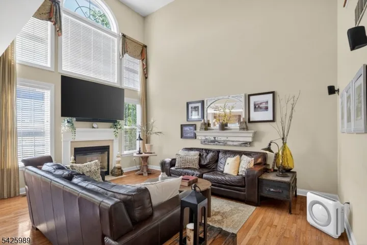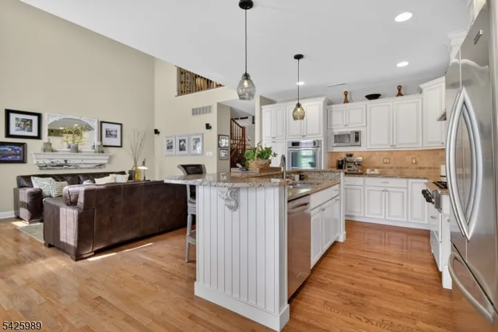 Perched above the Delaware River Valley in the coveted Lambert’s Hill community, this exceptional end unit offers breathtaking sunset views and a lifestyle defined by beauty and ease. Just moments from Lambertville with easy access to New Hope, Frenchtown, and scenic river towns, the location is truly unmatched.A welcoming front porch leads into sun filled interiors with rich hardwood flooring, elegant millwork, decorative columns, tray ceilings, and crown molding. Expansive palladium windows frame picturesque views and bring the outdoors in.The kitchen is designed for gathering, featuring a large granite island, tumbled marble backsplash, premium stainless steel appliances with a six burner range, and a farmhouse sink overlooking wooded views. The breakfast area opens to a maintenance free deck, perfect for dining and relaxing.The two story great room impresses with soaring ceilings and a gas fireplace, flowing into a comfortable family room for everyday living.Upstairs, the primary suite offers sweeping views, two walk in closets, and a spa like bath with soaking tub, dual sinks, and glass enclosed shower. Two additional bedrooms, a full bath, and linen storage complete the level.The finished walk out lower level includes a bedroom, half bath, and flexible space with access to a bluestone patio and yard.Additional highlights include designer paint, a two car garage, and a whole house Generac generator.